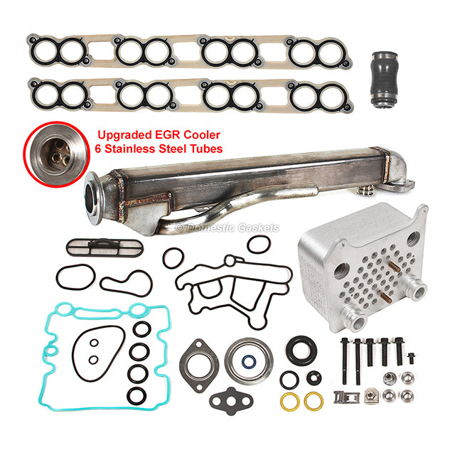 Upgrade Oil Cooler Upgraded EGR Cooler Kit Ford 6.0L OHV V8 Diesel Turbo. This engine EGR valve cooler kit is just what you need to keep your car in good running order. The engine EGR valve cooler kit that you will receive in this kit is high quality EGR cooler kit that the dealers and rebuilding shops use everyday. So do not settle for lesser quality parts when it comes to engine repair. These engine EGR valve cooler kits are designed for the professional installer. It does not come with any installation instructions. If you do not have a service manual, please consult a professional mechanic prior to installing this EGR cooler kit.