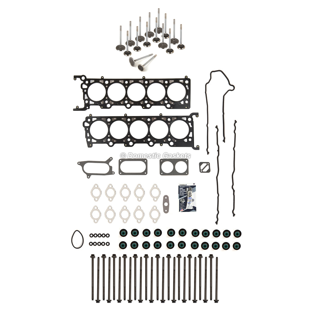 Head Gasket Set Intake Exhaust Valves Fit 97-02 Ford Excursion F250 F350 6.8L. This head gasket set with intake and exhaust valves is just what you need to keep your car in good running order. The head gasket set with intake and exhaust valves that you will receive in this kit are high quality gaskets and intake and exhaust valves that the dealers and rebuilding shops use everyday. So do not settle for lesser quality parts when it comes to engine repair. These gaskets and intake and exhaust valves are designed for the professional installer. It does not come with any installation instructions. If you do not have a service manual, please consult a professional mechanic prior to installing this head gasket set with intake and exhaust valves.