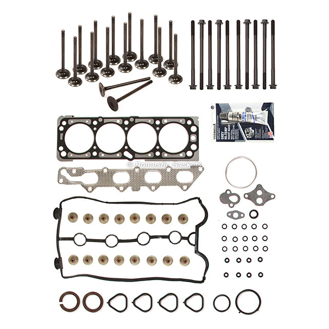 Fits 04-05 Chevrolet Aveo 1.6L Head Gasket Head Bolts Set Intake Exhaust Valves. This head gasket set with intake and exhaust valves is just what you need to keep your car in good running order. The head gasket set with intake and exhaust valves that you will receive in this kit are high quality gaskets and intake and exhaust valves that the dealers and rebuilding shops use everyday. So do not settle for lesser quality parts when it comes to engine repair. These gaskets and intake and exhaust valves are designed for the professional installer. It does not come with any installation instructions. If you do not have a service manual, please consult a professional mechanic prior to installing this head gasket set with intake and exhaust valves.