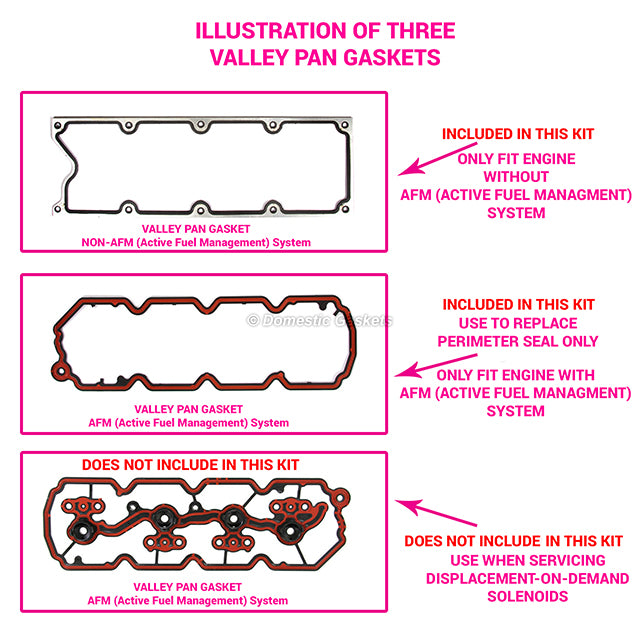 Remark: These MLS head gaskets are a direct replacement for the LS GM head gaskets. This gasket has everything you know and love from the GM version: high quality, bore opening: 4.100", compressed thickness: 0.054", MLS construction multi-layered steel (7 layers). This kit include the valley pan gaskets for engines with Active Fuel Management (AFM.) system, and without Active Fuel Management (AFM). However the plastic AFM valley pan gasket in this set only use to replace the perimeter seal only. This kit DOES NOT INCLUDE the complete valley pan gasket that use to service Displacement-On-Demand solenoids. For 2004 engines there are two different designs for the head bolts. 1st design head bolts have 16 Long Bolts: 150mm, 4 Short Bolts: 100mm, 10 Small Bolts: 45mm. 2nd design head bolts have 20 Long Bolts: 100mm, 10 Small Bolts: 45mm. This kit ONLY FITS engine with 2ND DESIGN HEAD BOLTS (20 long bolts: 100mm, 10 small bolts: 46mm). Please double check your engine head bolts to make sure this kit will fit your engine before making the purchase.