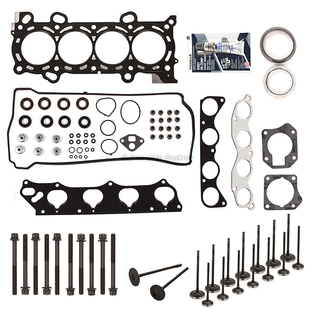 Head Gasket Set Intake Exhaust Valves Fits 04-09 Honda Acura 2.4L K24Z1 K24A2 A8. This head gasket set with intake and exhaust valves is just what you need to keep your car in good running order. The head gasket set with intake and exhaust valves that you will receive in this kit are high quality gaskets and intake and exhaust valves that the dealers and rebuilding shops use everyday. So do not settle for lesser quality parts when it comes to engine repair. These gaskets and intake and exhaust valves are designed for the professional installer. It does not come with any installation instructions. If you do not have a service manual, please consult a professional mechanic prior to installing this head gasket set with intake and exhaust valves.