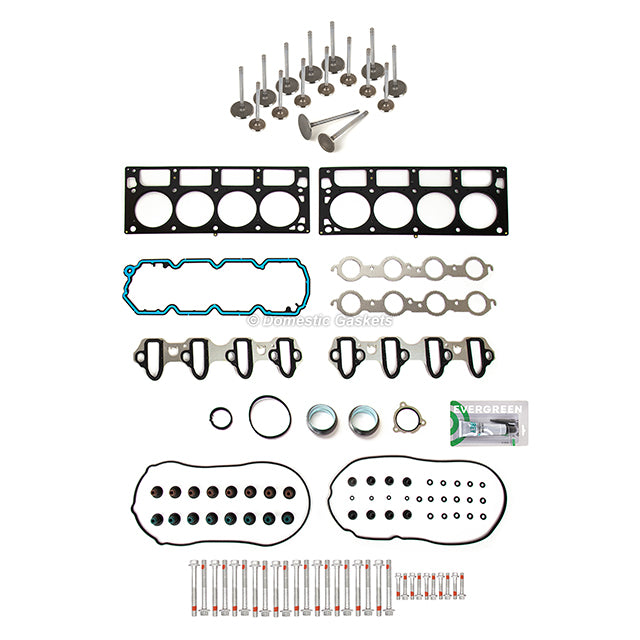 Head Gasket Set Intake Exhaust Valves Fit 10-13 Chevrolet Cadillac GMC 6.0L. This head gasket set with intake and exhaust valves is just what you need to keep your car in good running order. The head gasket set with intake and exhaust valves that you will receive in this kit are high quality gaskets and intake and exhaust valves that the dealers and rebuilding shops use everyday. So do not settle for lesser quality parts when it comes to engine repair. These gaskets and intake and exhaust valves are designed for the professional installer. It does not come with any installation instructions. If you do not have a service manual, please consult a professional mechanic prior to installing this head gasket set with intake and exhaust valves.