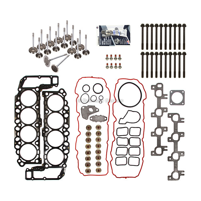 Head Gasket Set Intake Exhaust Valves Fit 99-03 Chrysler Dodge Jeep 4.7L SOHC. This head gasket set with intake and exhaust valves is just what you need to keep your car in good running order. The head gasket set with intake and exhaust valves that you will receive in this kit are high quality gaskets and intake and exhaust valves that the dealers and rebuilding shops use everyday. So do not settle for lesser quality parts when it comes to engine repair. These gaskets and intake and exhaust valves are designed for the professional installer. It does not come with any installation instructions. If you do not have a service manual, please consult a professional mechanic prior to installing this head gasket set with intake and exhaust valves.