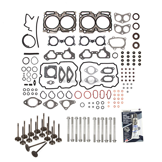 Head Gasket Set Intake Exhaust Valves Fit 04-06 Subaru Turbo 2.5L DOHC EJ255. This head gasket set with intake and exhaust valves is just what you need to keep your car in good running order. The head gasket set with intake and exhaust valves that you will receive in this kit are high quality gaskets and intake and exhaust valves that the dealers and rebuilding shops use everyday. So do not settle for lesser quality parts when it comes to engine repair. These gaskets and intake and exhaust valves are designed for the professional installer. It does not come with any installation instructions. If you do not have a service manual, please consult a professional mechanic prior to installing this head gasket set with intake and exhaust valves.